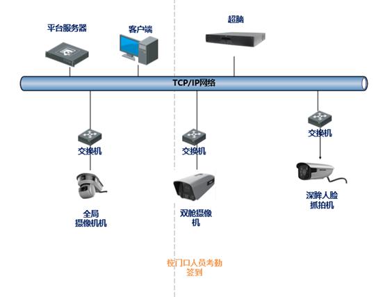 前端人臉抓拍攝像機可在校門口出入口的區域內進行人臉抓拍,并將人臉圖片傳給后端超腦進行分析比對,比對成功確認人員身份的會在平臺上顯示簽到信息,若比對失敗,則會觸發陌生人告警并在系統有提示信息給校門口管理人員,該模式由于無需學生停留配合,故不會造成校門口門口通行受阻的現象。