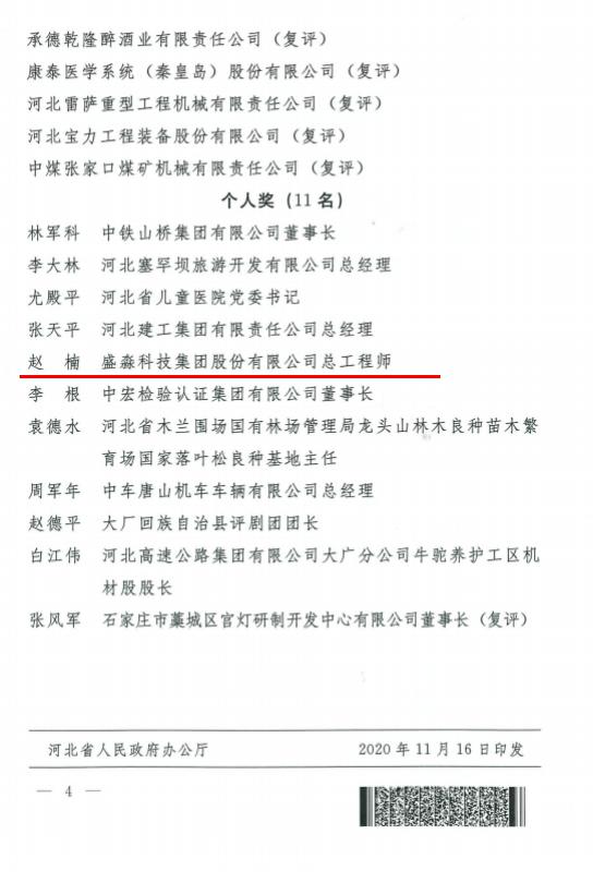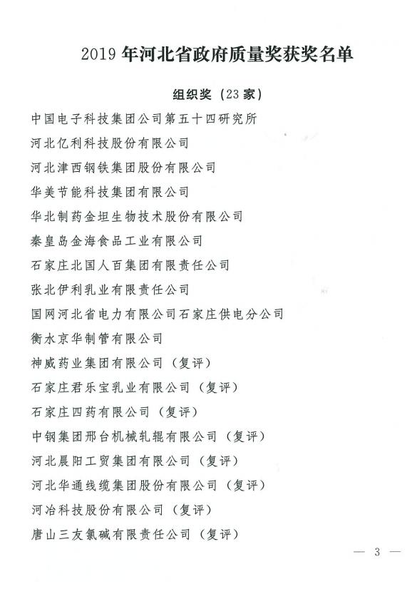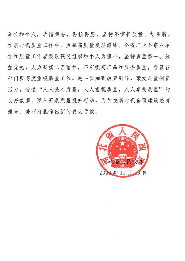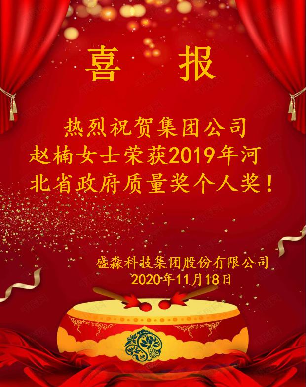 日前,河北省政府發文通報了2019年省政府質量獎獲獎企業和個人名單,我集團公司趙楠女士榮獲河北省政府質量獎個人獎。